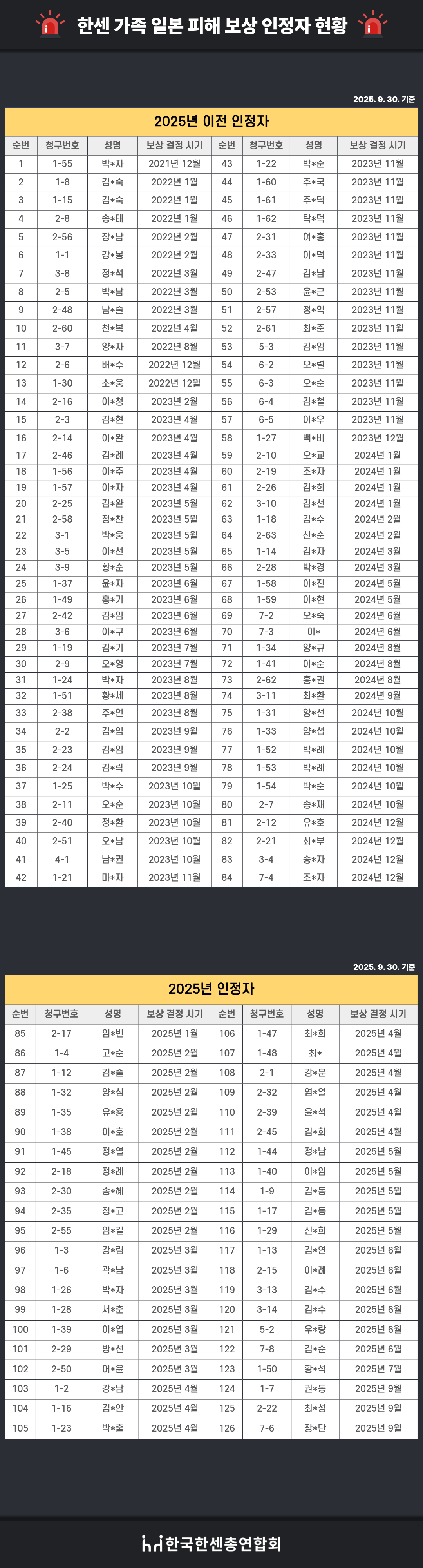 한센 가족 일본 피해 보상 인정자 현황 (2025. 9. 30. 기준)