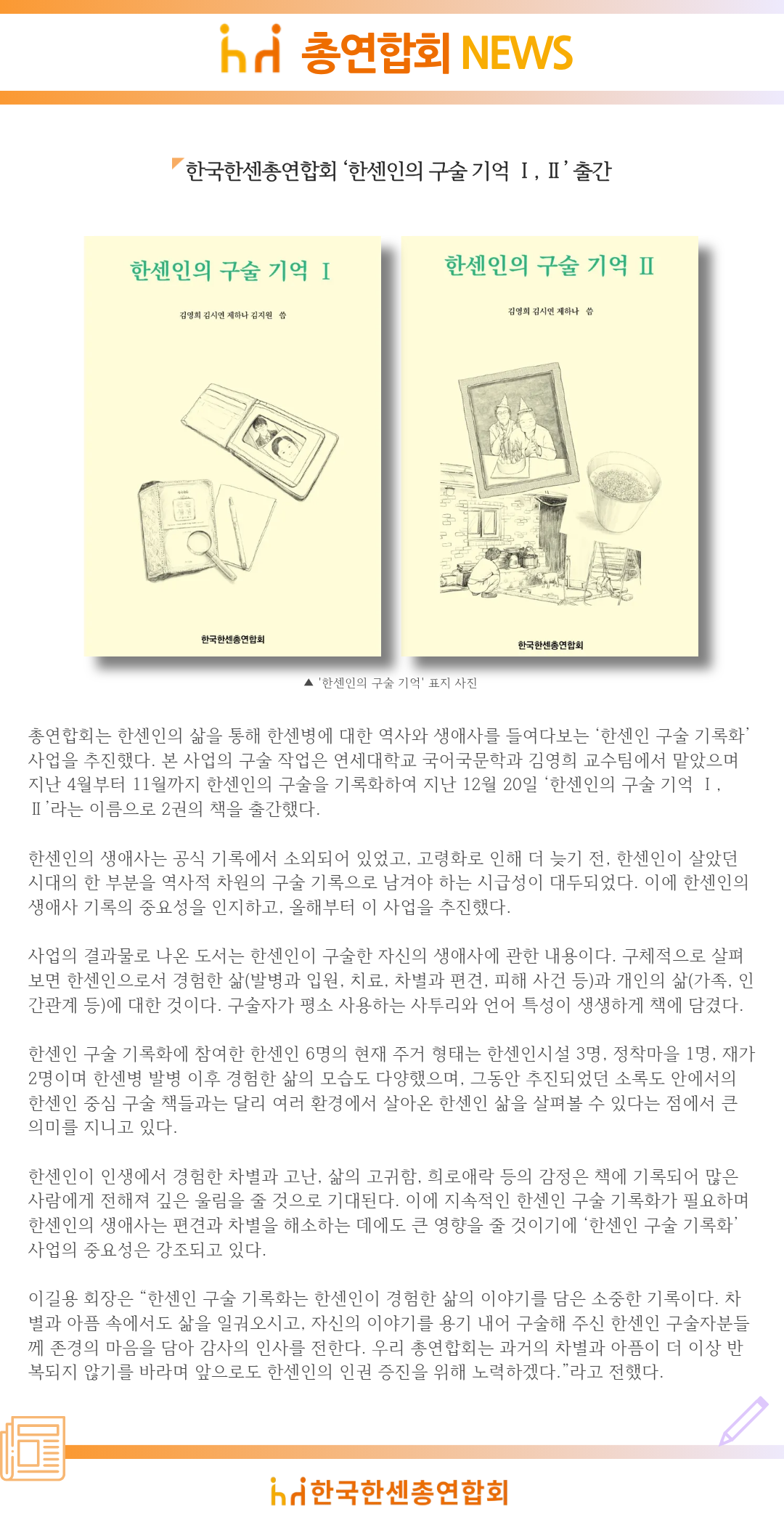 한국한센총연합회 ‘한센인의 구술 기억 Ⅰ, Ⅱ’ 출간